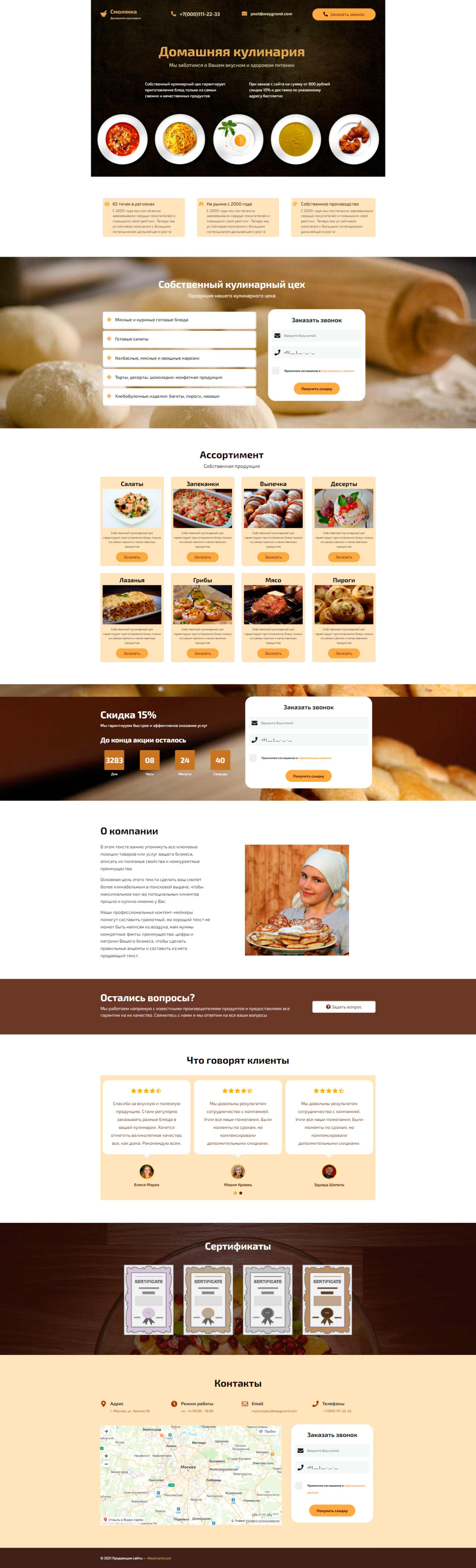 - Блок "Собственный кулинарный цех" с формой "Заказать звонок"